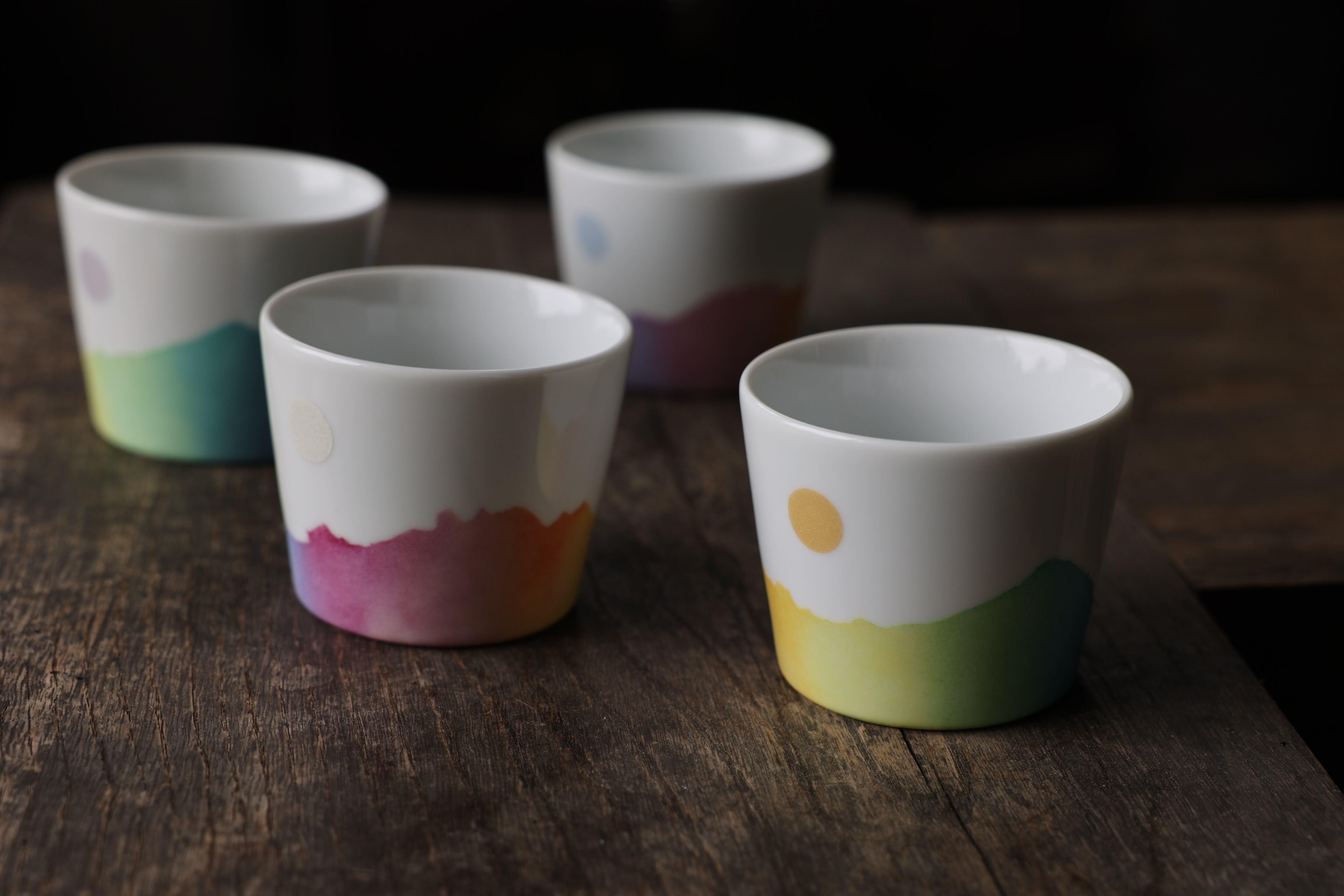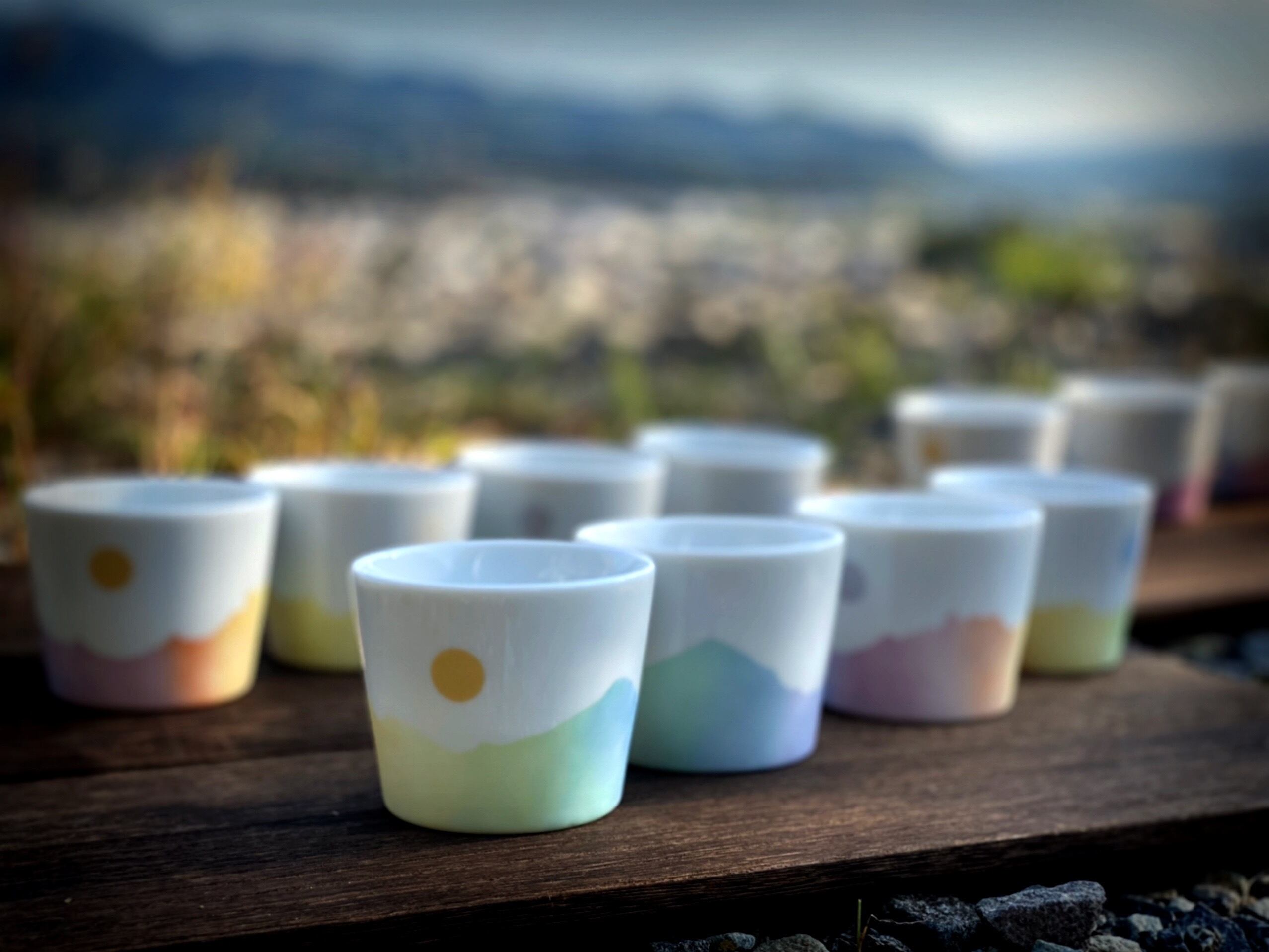yamaniaの工房のある和やか(にこやか)の山からの眺めを絵付けしたフリーカップです。